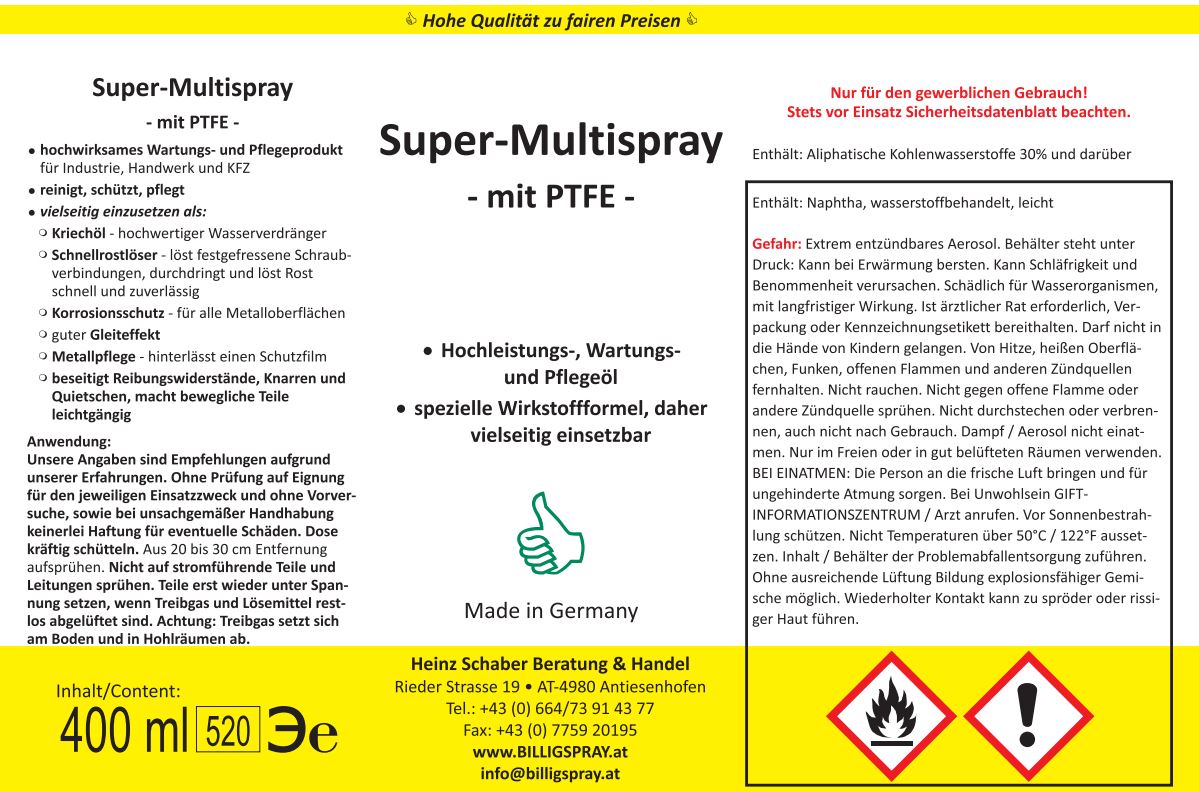 Spezialöl mit PTFE zur Wartung und Pflege, für eine Vielzahl von Einsatzbereichen in Industrie, KFZ-Betrieben, Handwerk usw. Hohe, langanhaltende Schmierwirkung, niedriger Reibwert und Sicherung von Notlaufeigenschaften durch den Zusatz von Teflon.